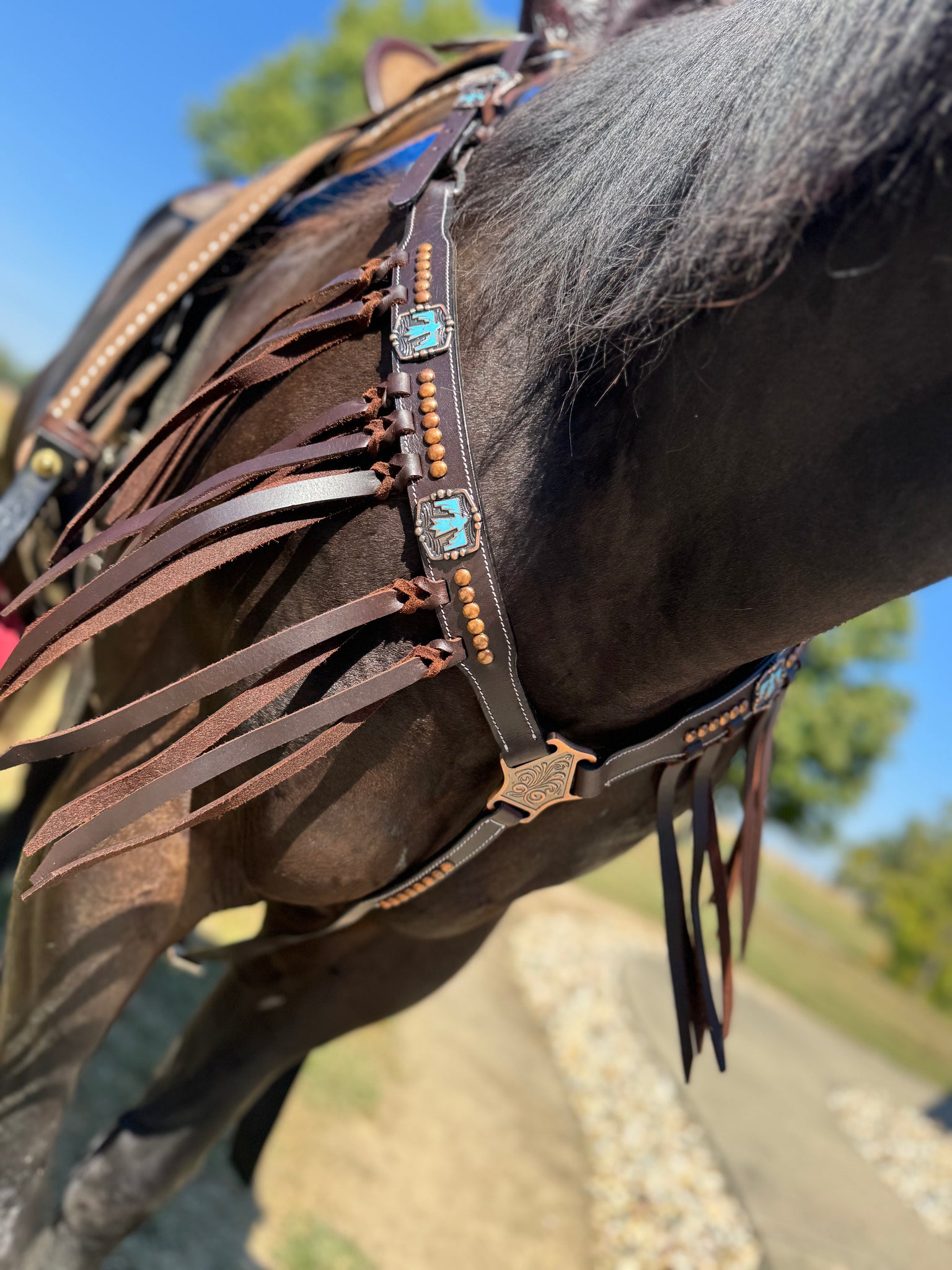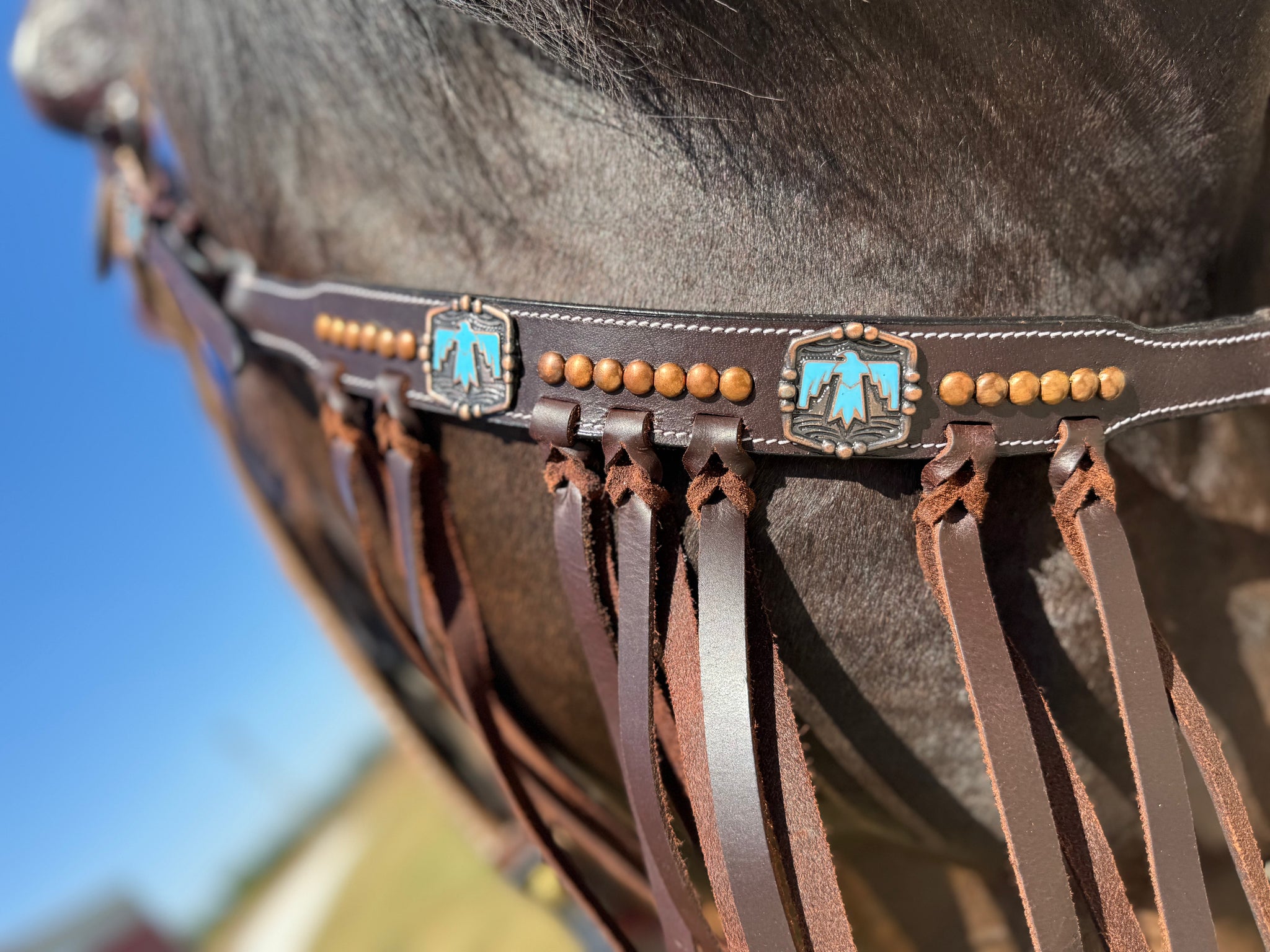 Leather Breastcollar with turquoise thunderbird Conchos and fringe